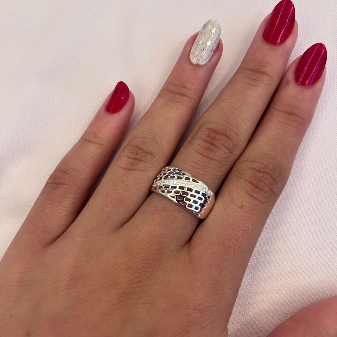 Invista em uma peça de impacto que certamente será o destaque do seu mostruário. Este Anel Largo Vazado em Prata 925 é uma joia moderna, com 9.5mm de largura, que atrai clientes que buscam design diferenciado e presença.
