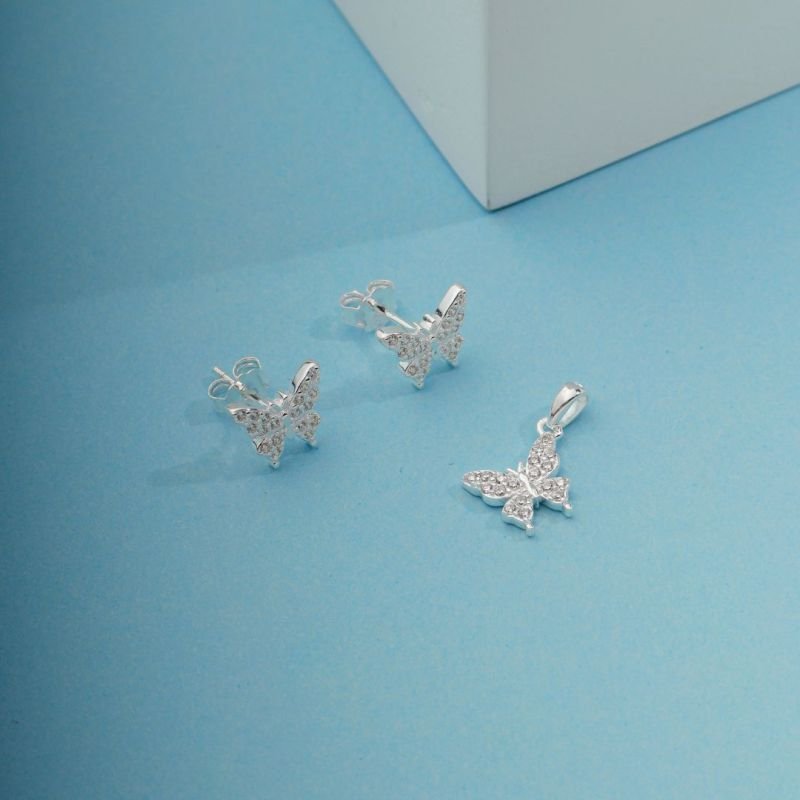 Maximize Seus Lucros Revendendo Prata 925! Este conjunto é perfeito para presentear em ocasiões especiais ou para uso diário de quem ama acessórios femininos e brilhantes. Ter borboletas no seu portfólio é sinônimo de sucesso constante, pois este design nunca sai de moda e mantém uma demanda altíssima o ano todo.