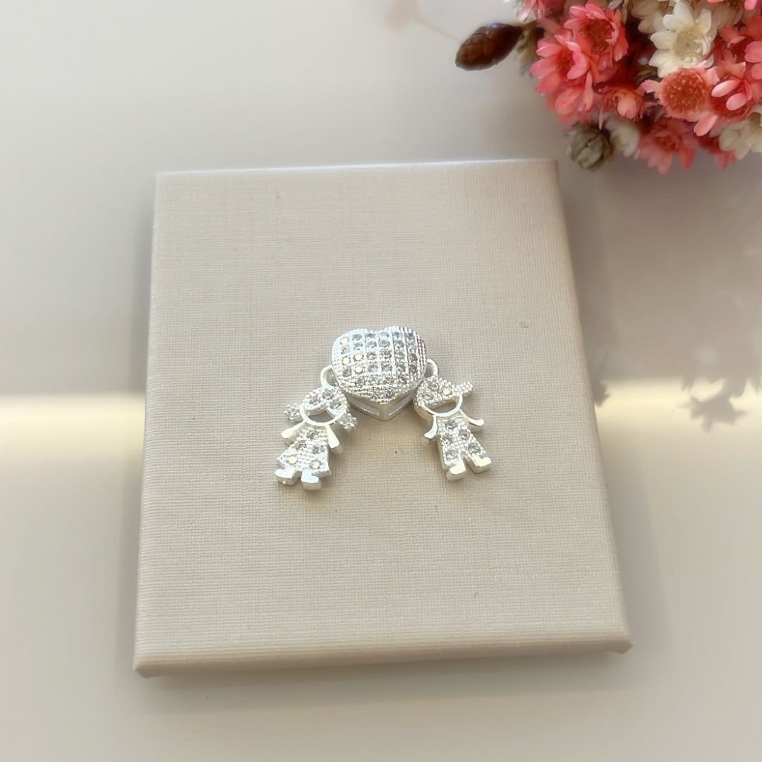Adicione uma peça de alto valor emocional e apelo universal ao seu mix de produtos. Este Pingente em Prata 925 apresenta o formato de coração com detalhes que remetem aos filhos (assumindo bonequinhos, silhuetas ou gravação, e que o coração é cravejado), um item que atrai mães, avós e familiares em geral.