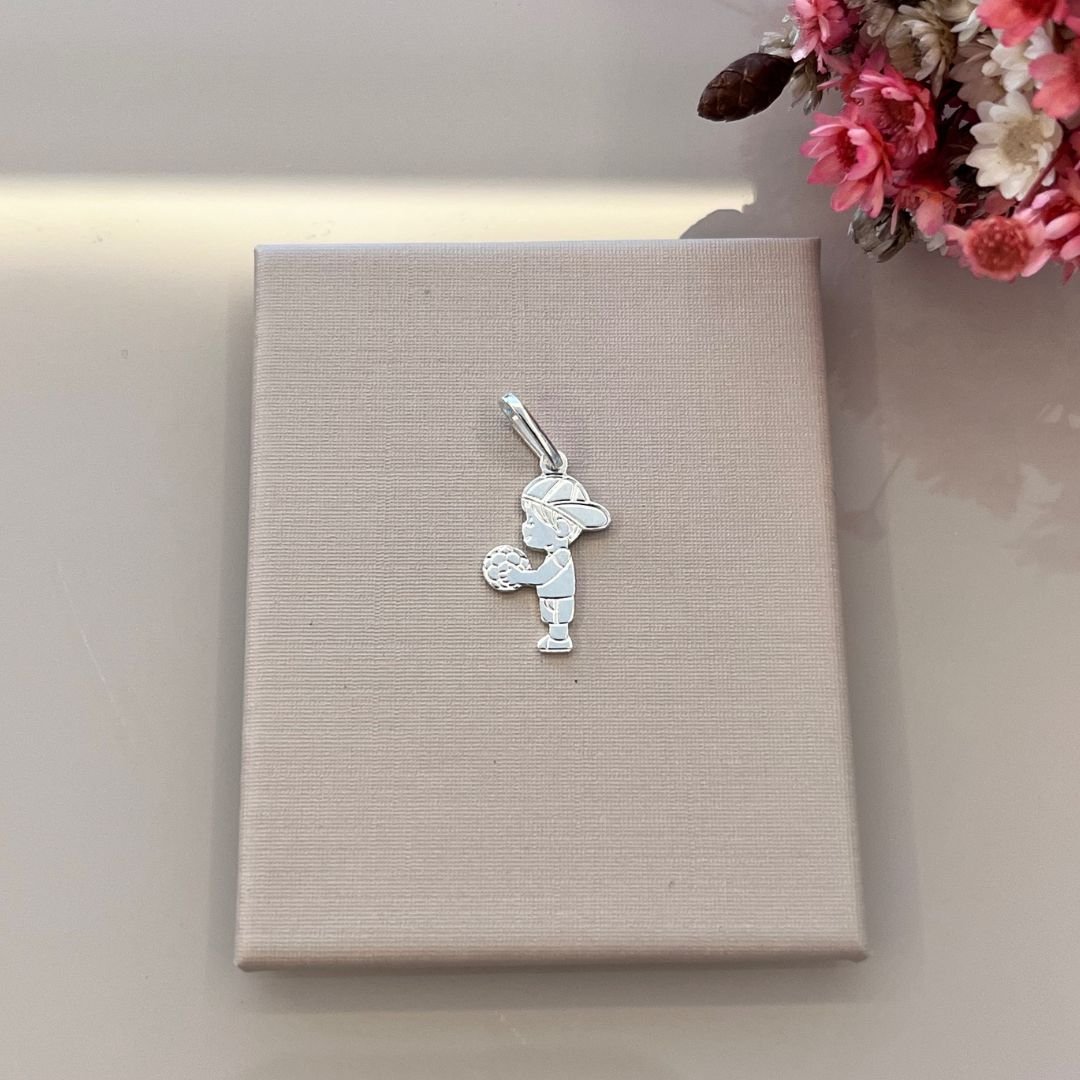 Adicione uma peça de alto valor emocional e apelo universal ao seu mix de produtos. Este Pingente em Prata 925 apresenta o formato de menino (bonequinho) com uma bola, com 17mm, um item clássico que atrai mães, avós, familiares e amantes de esporte em geral.